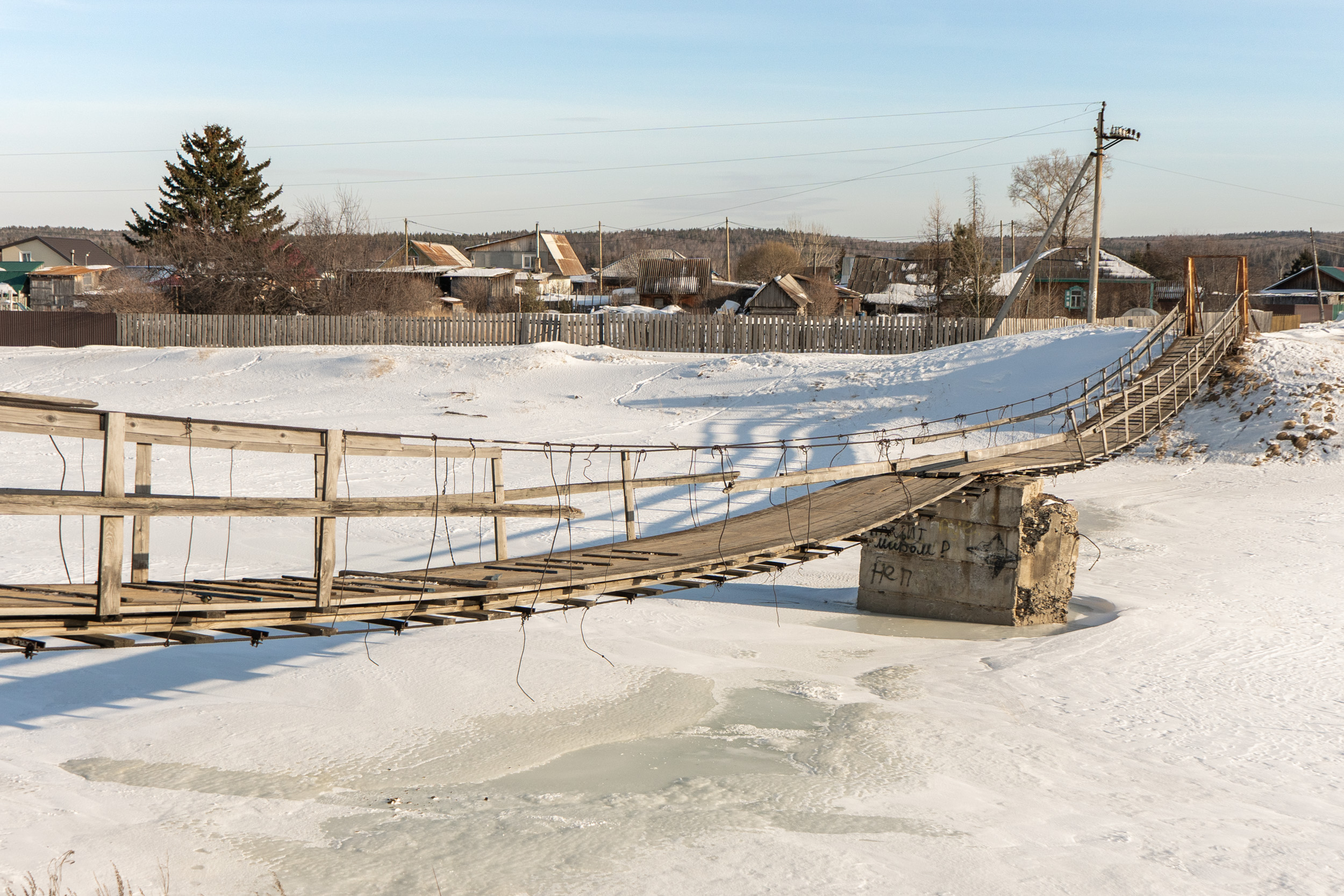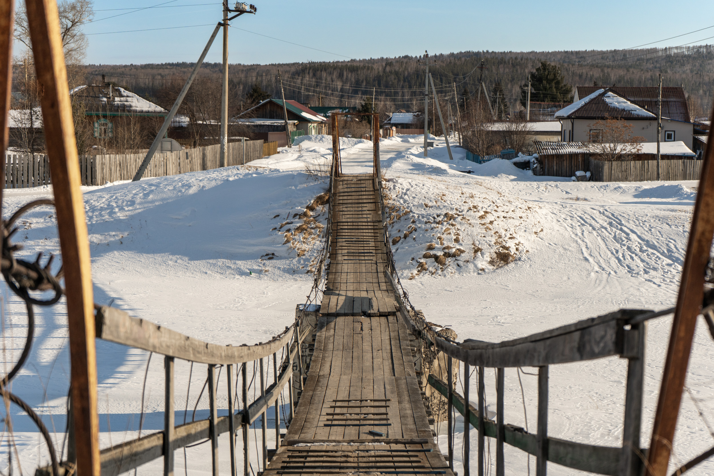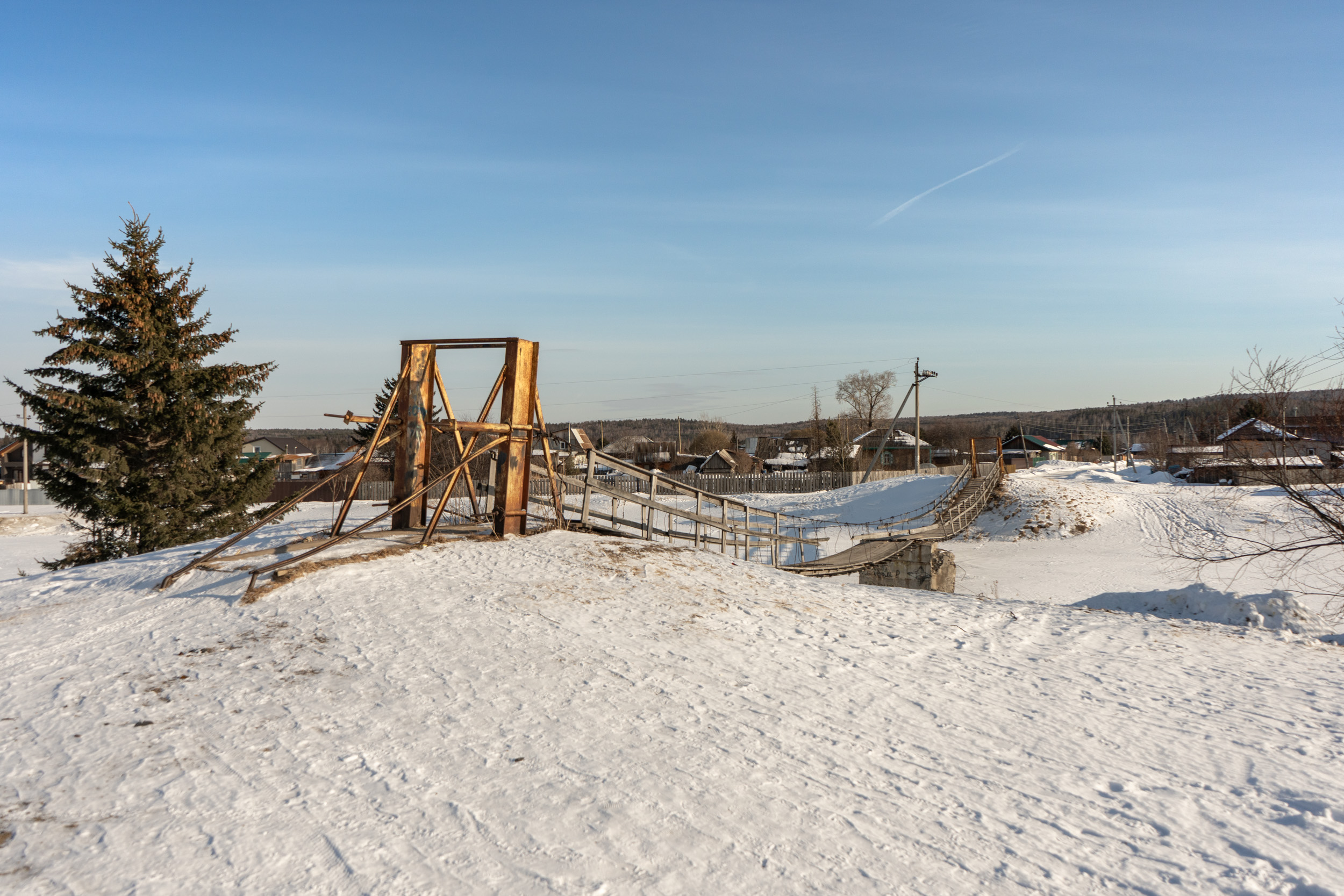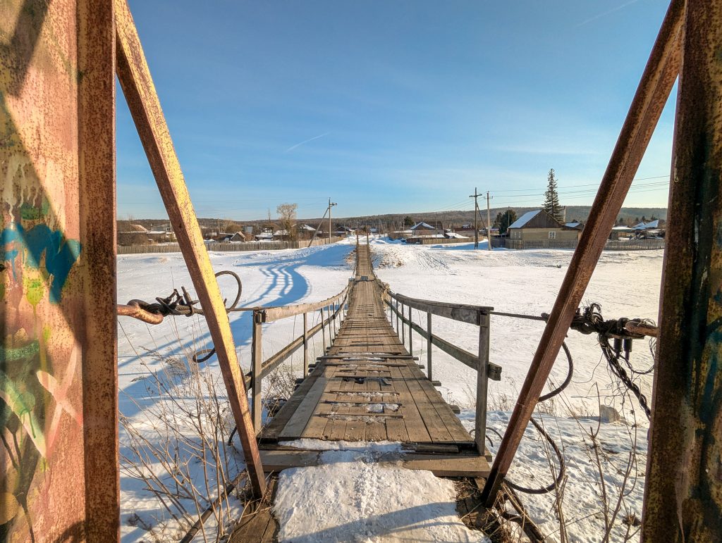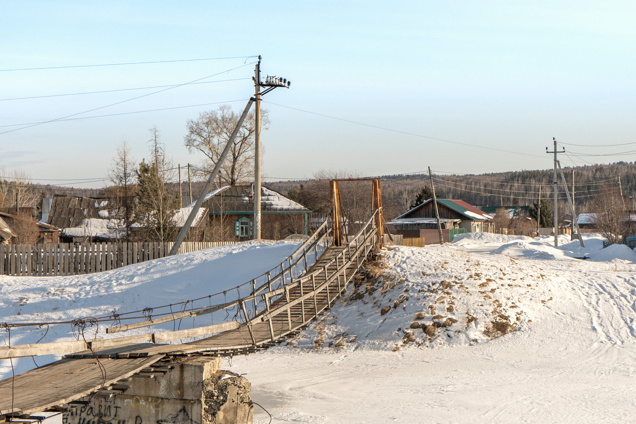 Небольшой подвесной пешеходный мост через реку Качу в п. Памяти 13 борцов находится на пересечении улиц Копылова и Провознюка. Длина моста около 50 м. Изготовлен из дерева и металла, посередине реки есть дополнительная опора из бетона.