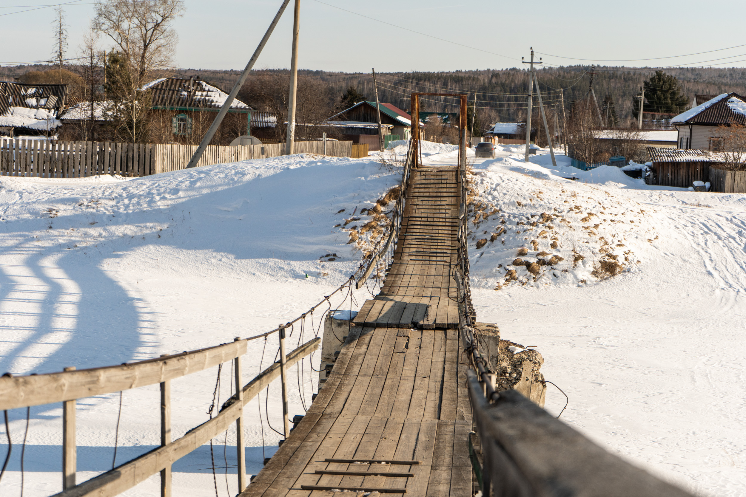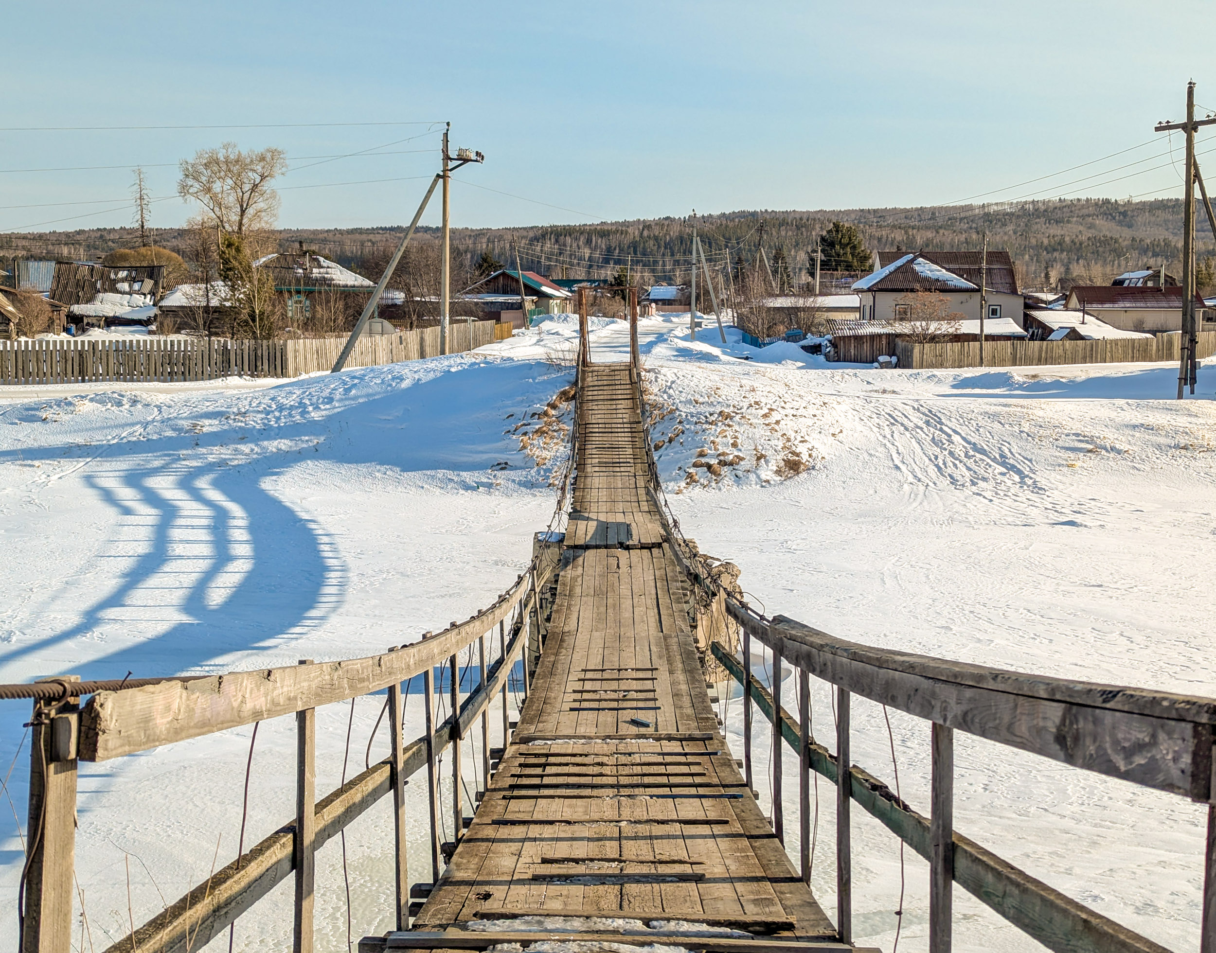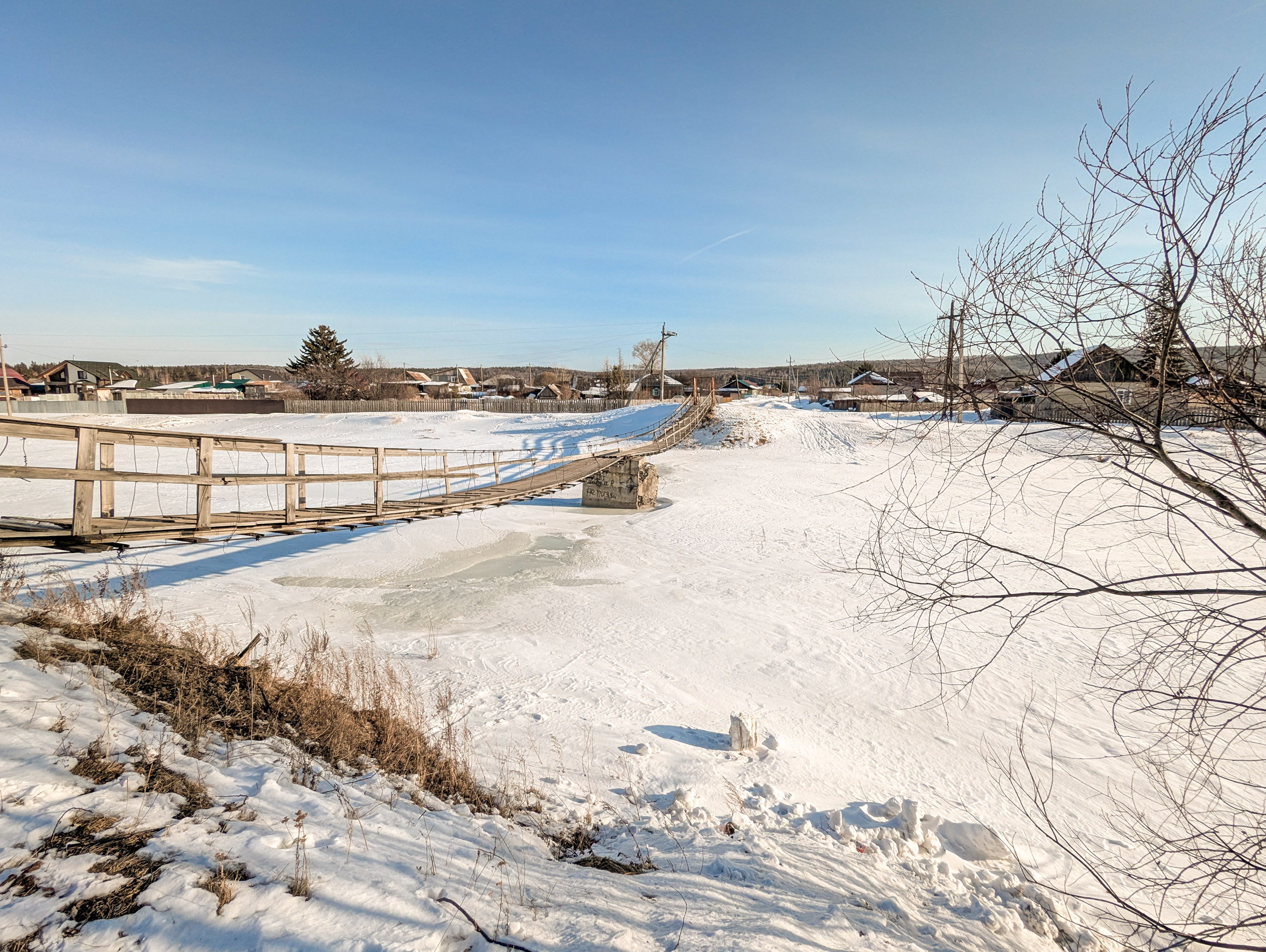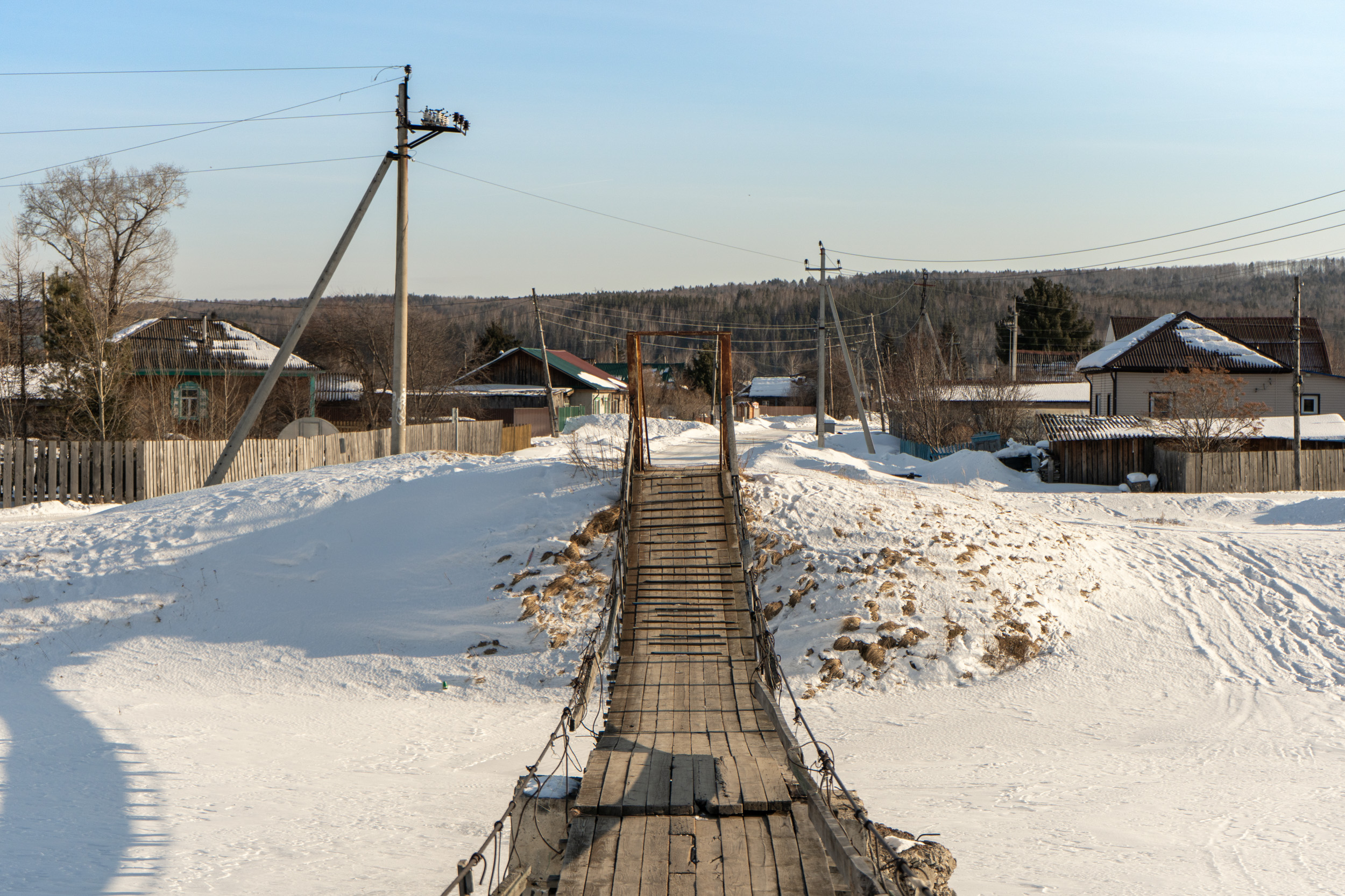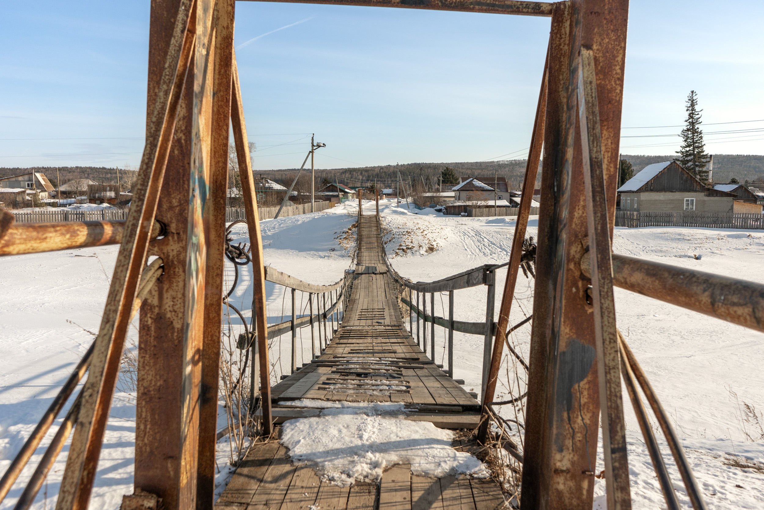 Небольшой подвесной пешеходный мост через реку Качу в п. Памяти 13 борцов находится на пересечении улиц Копылова и Провознюка. Длина моста около 50 м. Изготовлен из дерева и металла, посередине реки есть дополнительная опора из бетона.